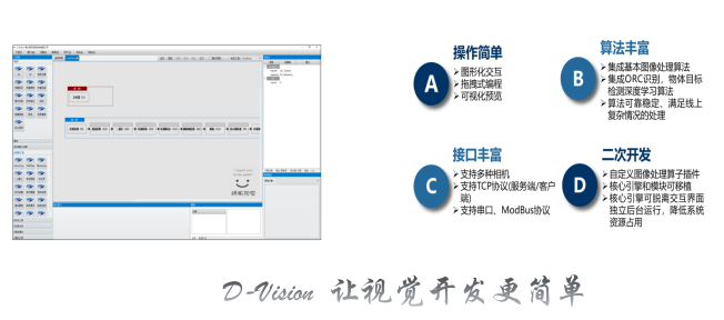 平台功能:功能强大的视觉检测开发平台,集成了常用视觉算法库和AI算法库,可快速实现测量、传感、定位、检测、识别等功能。