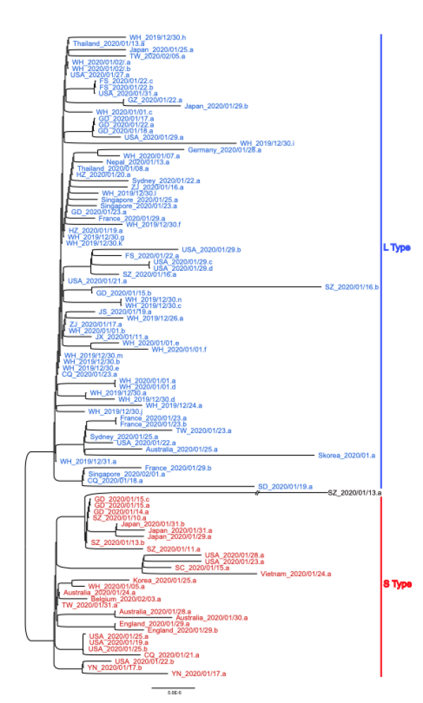 论文通过对目前为止最大规模的103个新冠病毒全基因组分子进化分析,发现病毒株已发生了149个突变点,而且多数是近期产生的。该研究揭示:新冠病毒已经演化出L和S两个亚型。其中101个属于这两个亚型。从占比上看,L亚型更为普遍达到70%,S亚型占30%。