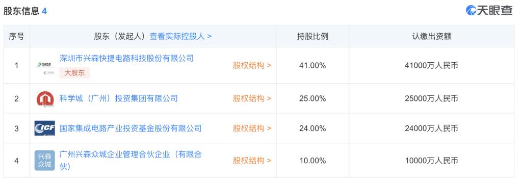 天眼查数据显示,近日,国家集成电路产业投资基金股份有限公司新增对外投资,出资2.4亿人民币,持股24%,参与成立广州兴科半导体有限公司。广州兴科半导体有限公司成立于2020年2月24日,经营范围包括集成电路封装产品设计、集成电路封装产品制造、电子元件及组件制造等。天眼查股东信息显示,公司第一大股东为A股上市公司兴森科技的运营主体兴森快捷电路,持股比例为41%。